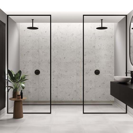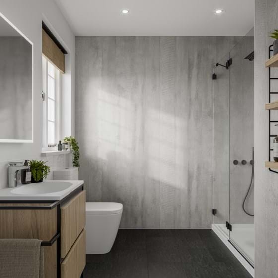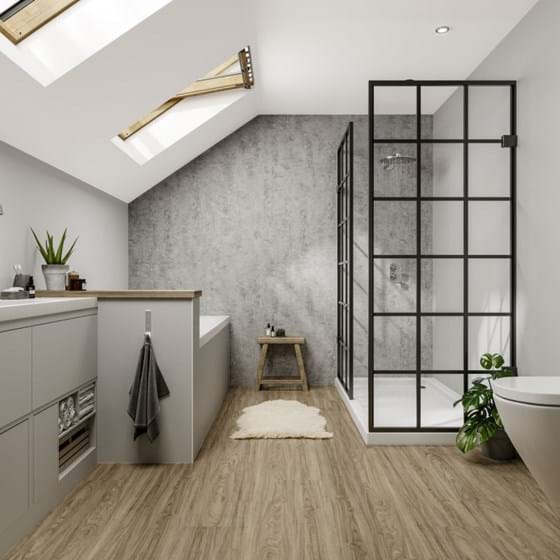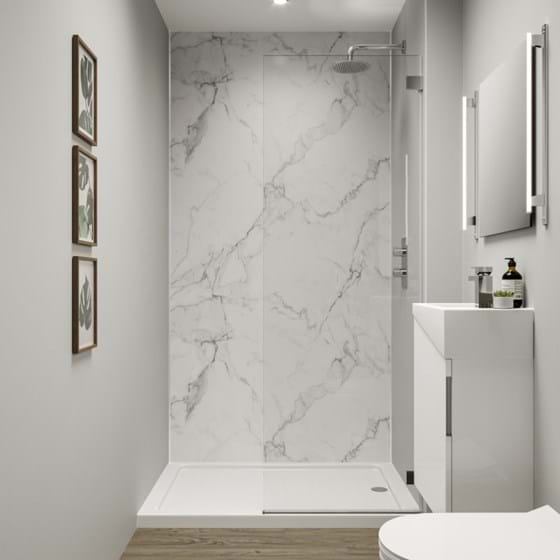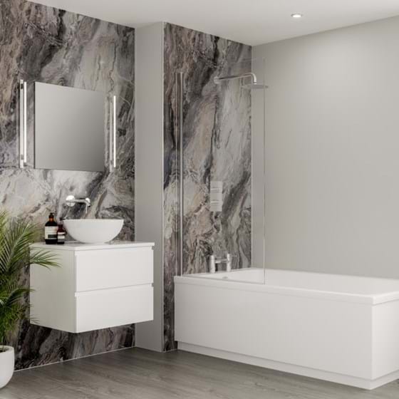 If you are looking for a more traditional look, why not choose feature wall tiles? They naturally brighten spaces and change the ambience in a room. They can even help create a visual barrier in open-plan shower rooms. Our White Terrazzo tile effect panel contains pale, grey colour variations and makes a stunning grey feature wall for darker furniture or oversized bathtubs. For slightly darker variations, choose Valmasino Marble.