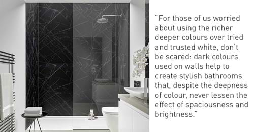 For those of us worried about using the richer deeper colours over tried and trusted white, don’t be scared: dark colours used on walls help to create stylish bathrooms that, despite the deepness of colour, never lessen the effect of spaciousness and brightness. When, for example, I see my Ferro Grafite (discontinued) or Nero Grafite (discontinued) panels in use, I wonder why anyone wouldn’t want to use a dark colour in a bathroom.