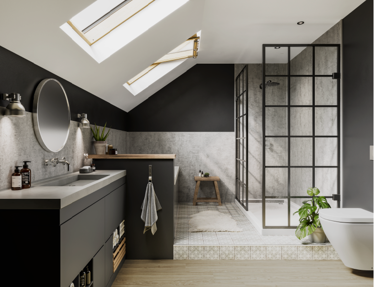 My Concrete Elements wall panel is a great starting place for a pretty kids bathroom, position the bathroom panels both behind the bath tub and behind the wash basin for the best effect and ease of cleaning.