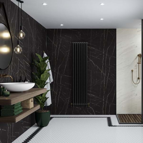 Marble doesn't have to be white. Black Pietra is a black marble decor with stunning white veins. Due to this criss-cross effect, the panel works well on its own but can also be paired with Levanto Marble from the Pure Collection to create a black feature wall.