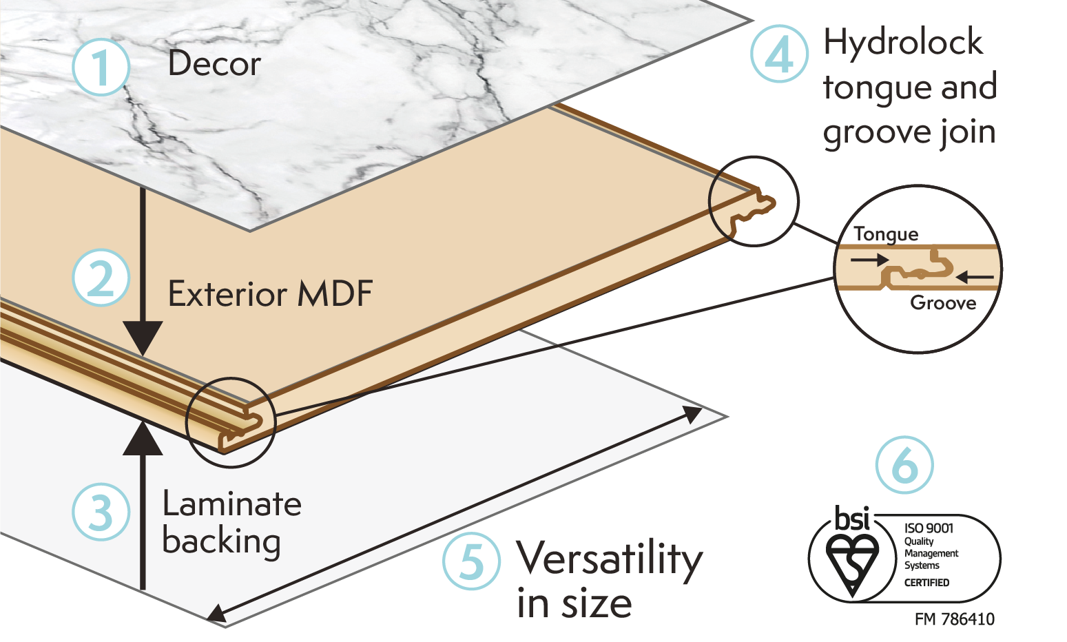 The laminate backing reduces the potential for bowing (3). Our innovative Hydrolock T&G joint and 6mm tolerance for fitting over uneven surfaces makes installation a breeze (4).